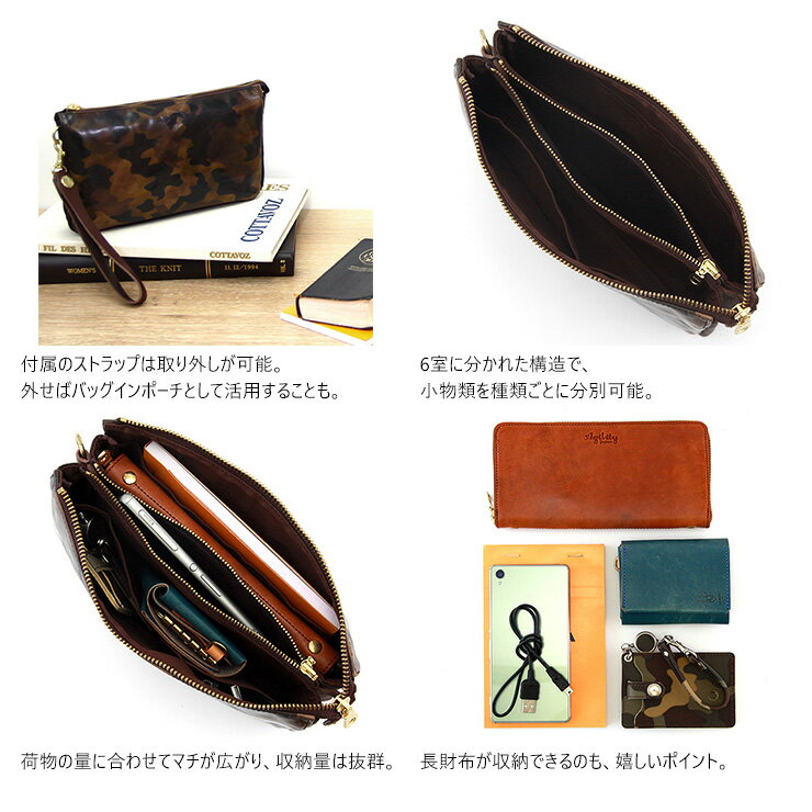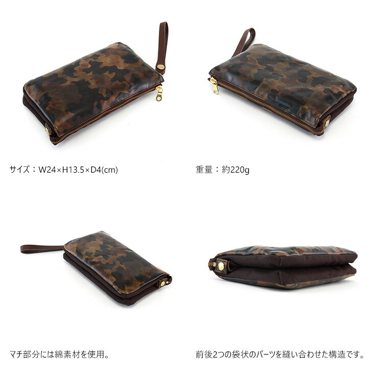 ■素材:牛革・綿/■サイズ:W24×H13.5×D4(cm)/■重量:約220g 【 クラッチバッグ / セカンドバッグ / バッグインバッグ / 牛革 / レザー / 本革 / 日本製 / 迷彩 / カモフラージュ 】 素材について 国産の牛原皮を姫路のタンナーにてAGILITY独自のオーダーで仕上げたメイドインジャパンのオリジナルレザーです。