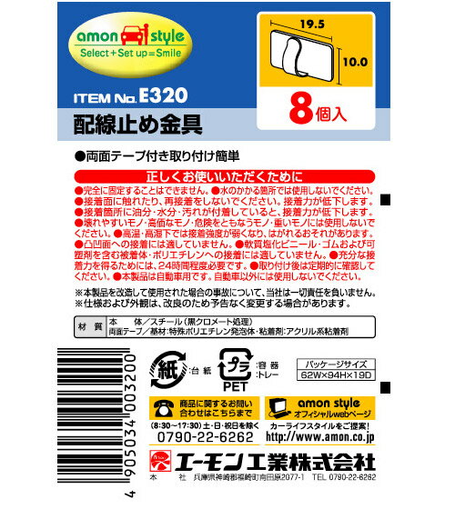 ネコポス可● 【エーモン工業】E320配線止め金具両面テープ付