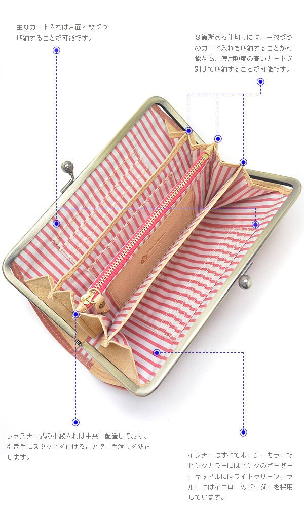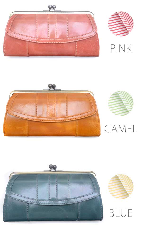 サイズ ・(約)縦12cm×横20.2cm×厚み3.0cm 素材 ・プルアップレザー(牛革) カラ− ・ピンク ・キャメル ・ブルー 仕様 ・開閉がま口 ・札入れ×4 ・カード入れ×11 ・ファスナー式小銭入れ×1 ・外側ホック式フリーポケット×1 付属品 ・純正BOX 生産国 ・日本製 ラッピング ・ラッピングご希望の方は選択肢よりお選び下さい。